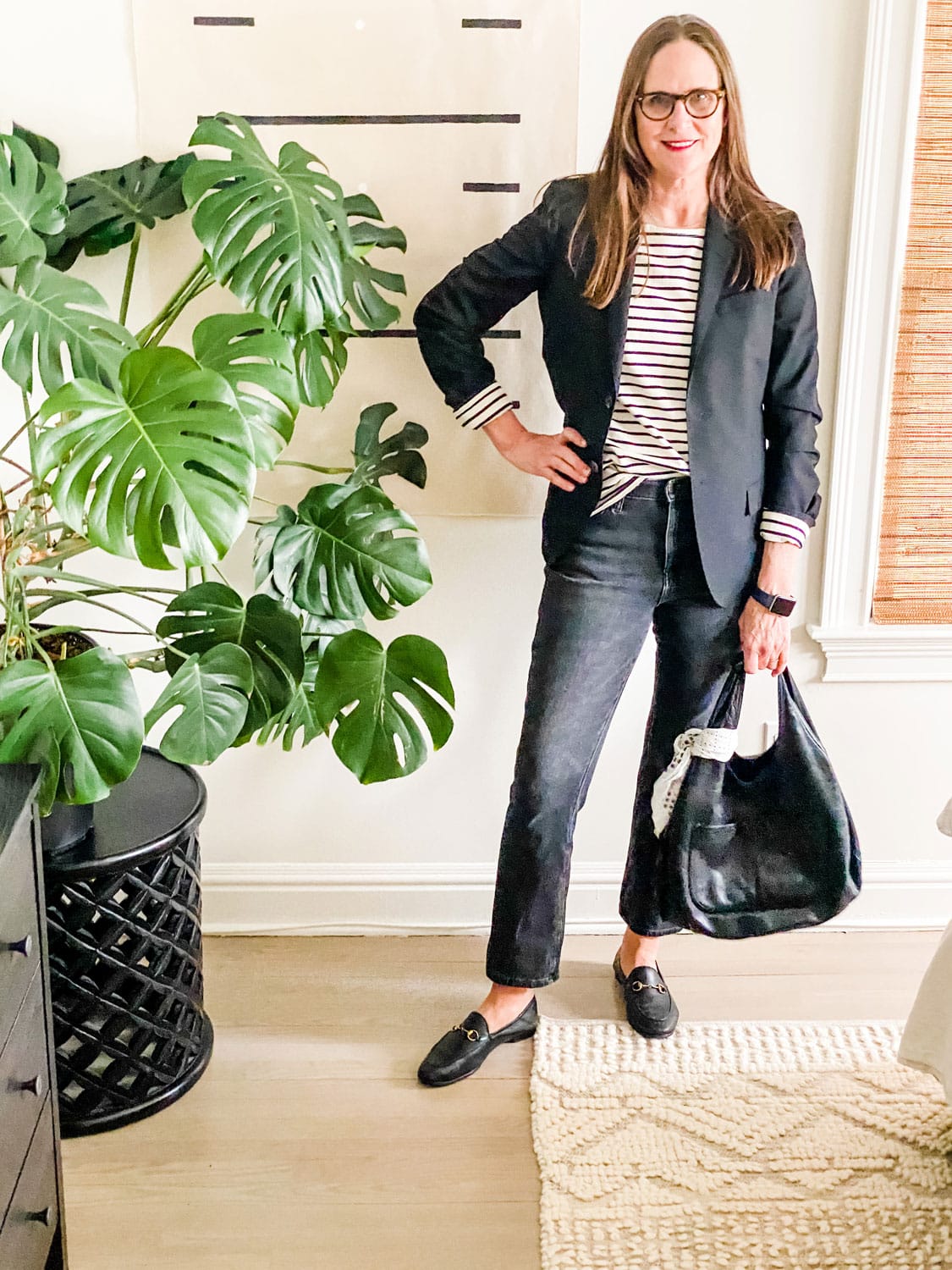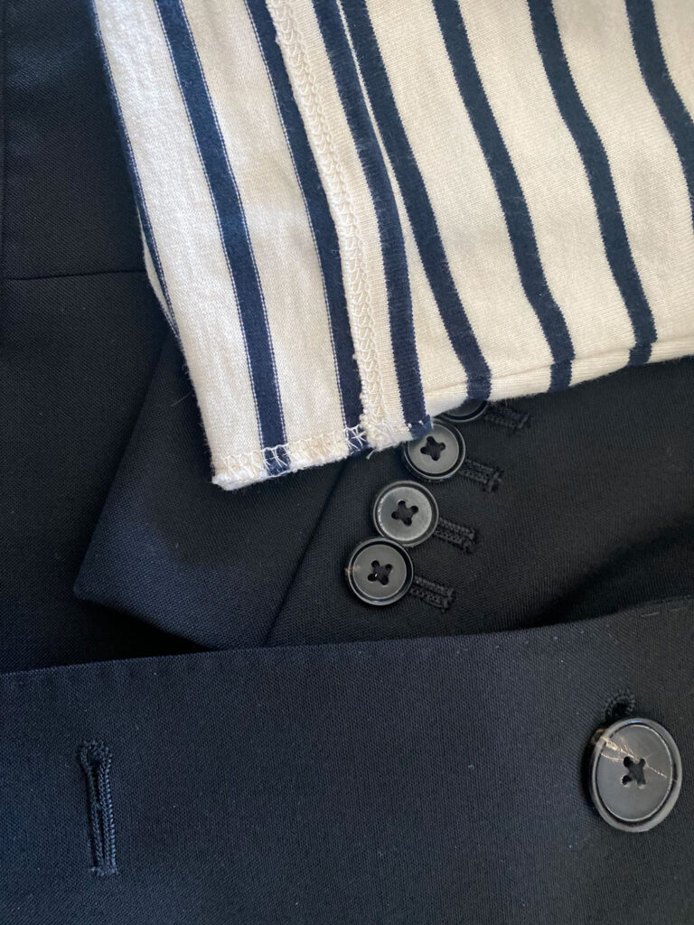 Nothing says spring like a striped shirt. This one is the boyfriend-cut striped shirt from Kule. It’s a bit oversize because it’s a boyfriend reduce, and that makes it simple to put on. I like carrying it with a black blazer and rolling up the sleeves to point out the stripes.