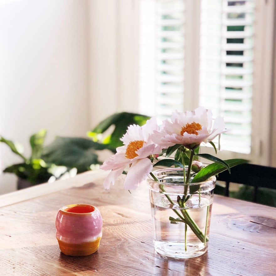 The final of the peonies alongside a bit of vessel Madeline made on a pottery wheel in center faculty.
