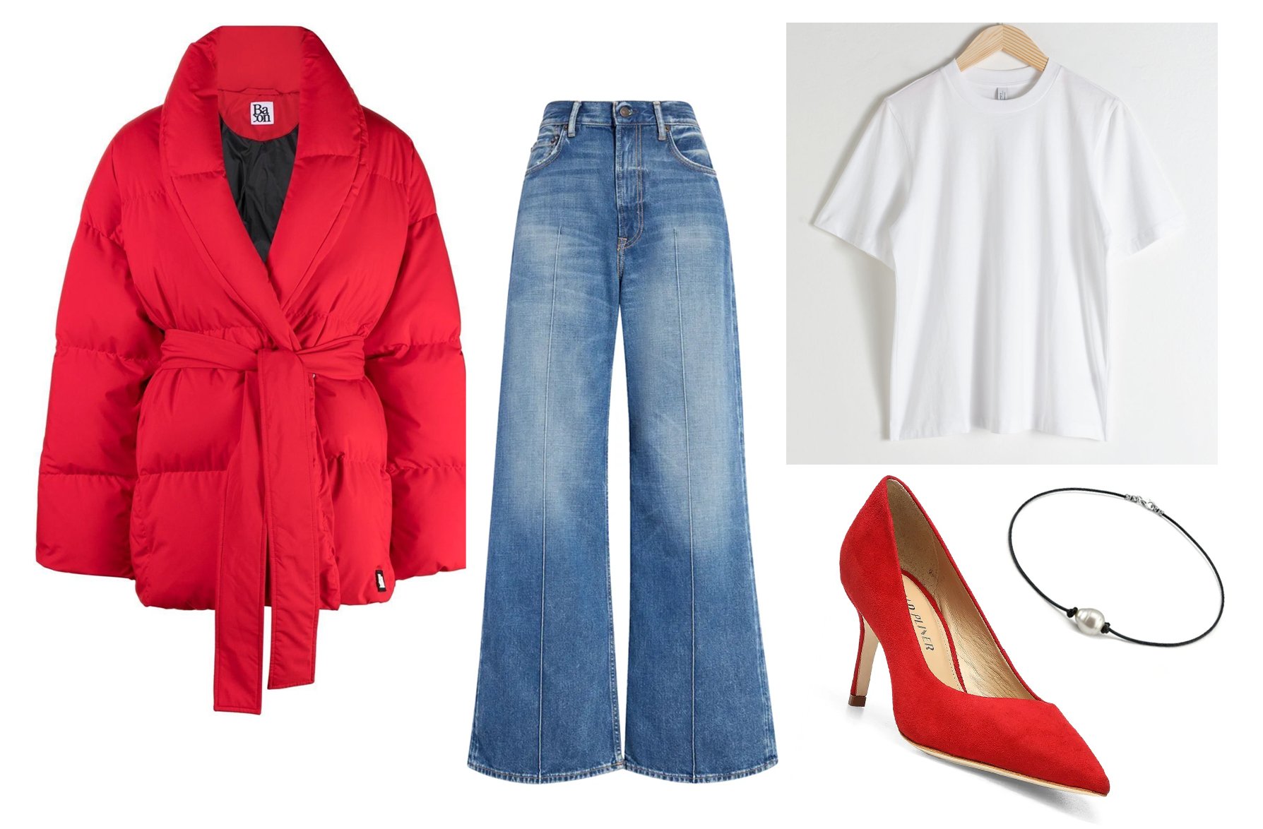Crimson Puffer Jacket / Large Leg Denims / White Tee / Crimson Pumps / Leather-based Baroque Pearl Necklace