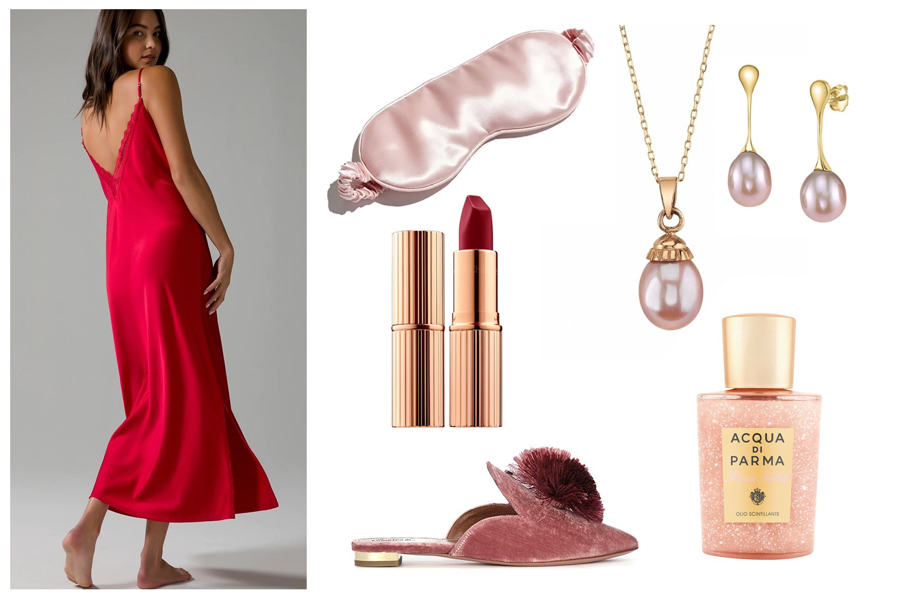 Satin & Lace Lengthy Robe / Puff Pompom Mules / Matte Revolution Lipstick / 14K Gold Pink Freshwater Cultured Pearl Pendant / Slip Silk Eye Masks / Pink Freshwater Pearl Teardrop Earrings / Acqua di Parma Shimmering Oil