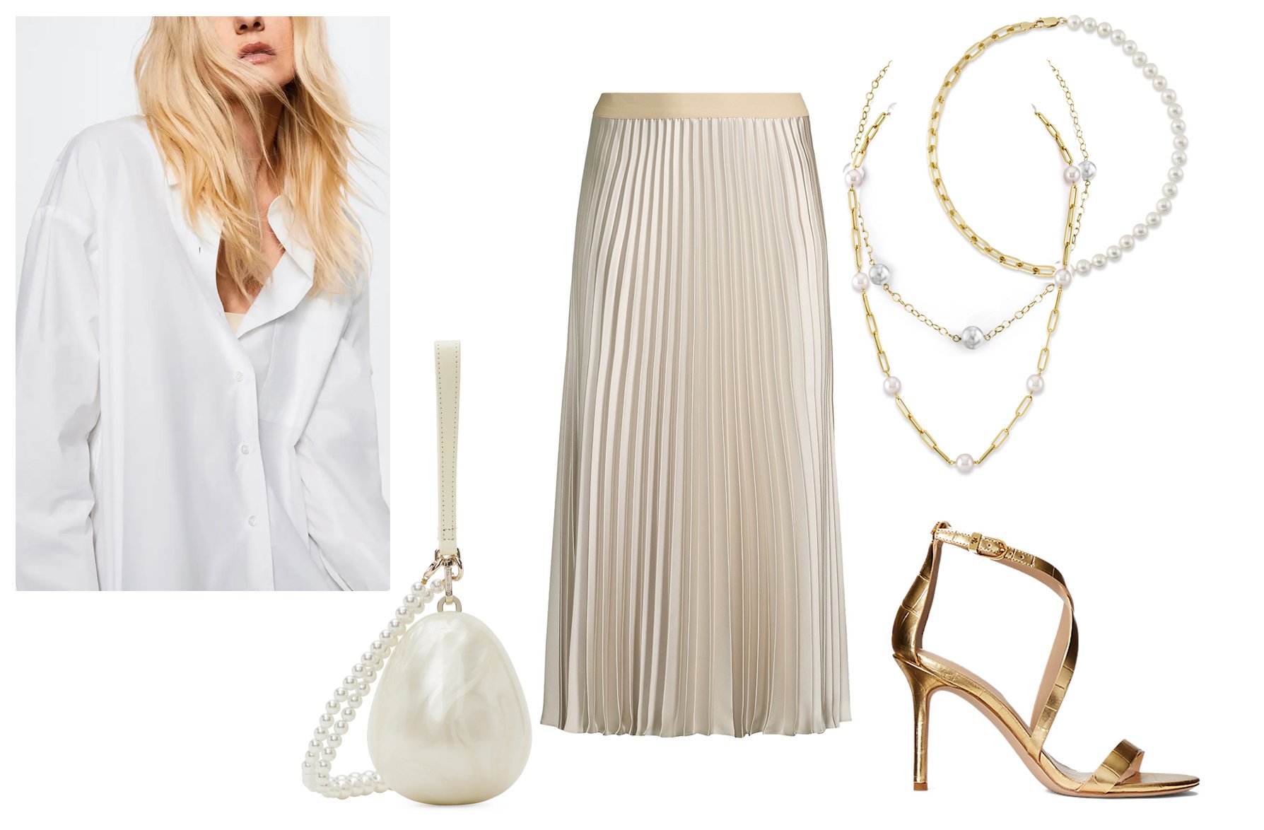 Oversize White Shirt / Pearl Bag / Pleated Skirt / Akoya Pearl Chain Hyperlink Necklace / Tincup Pearl Necklace / Half Pearl Necklace / Golden Strap Sandals