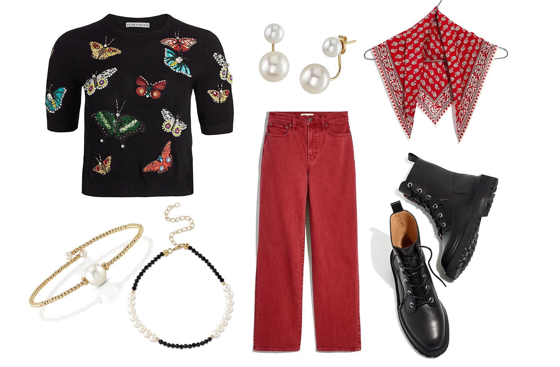 Butterfly Embroidered Sweater / Pearl Beaded Bangle Bracelet / Pearl & Black Spinel Gwen Bracelet / Freshwater Pearl Jacket Livia Earrings / Classic Large-Leg Jean / Natural Cotton Bandana / Lace-Up Boot in Leather-based