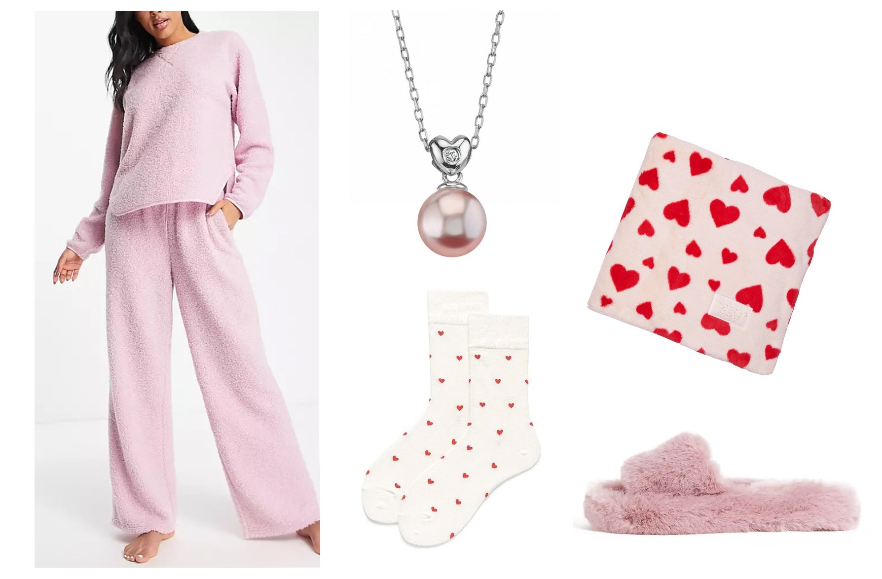 Lounge Set in Pink / Pink Freshwater Pearl & Diamond Pendant /  Coronary heart Socks / Cozy Plush Fleece Coronary heart Blanket / Fake Fur Slippers