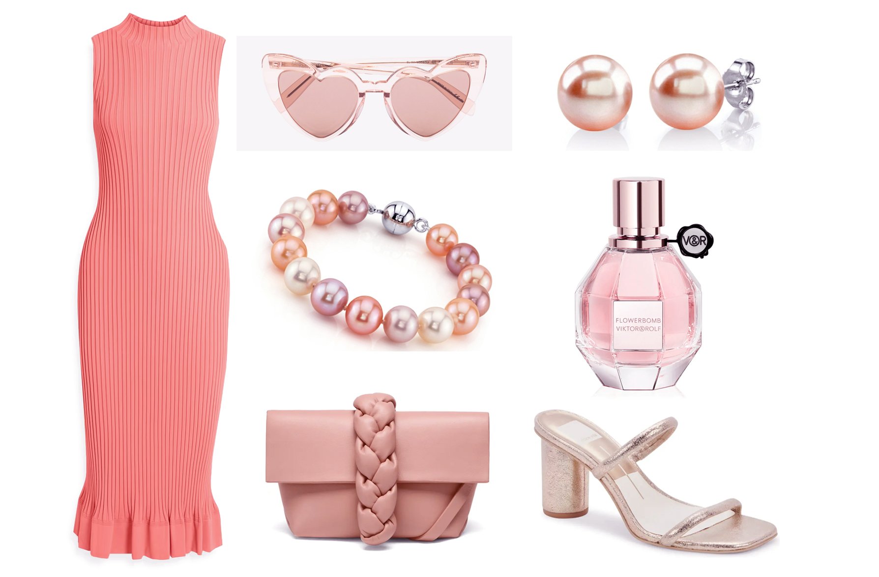 Ribbed-Knit Midi Costume / Coronary heart Sun shades / Multicolor Freshwater Pearl Bracelet / Mini Verona Leather-based Crossbody Bag / Peach Freshwater Spherical Pearl Stud Earrings / Flowerbomb Perfume Spray / Noles Metropolis Slide Sandal