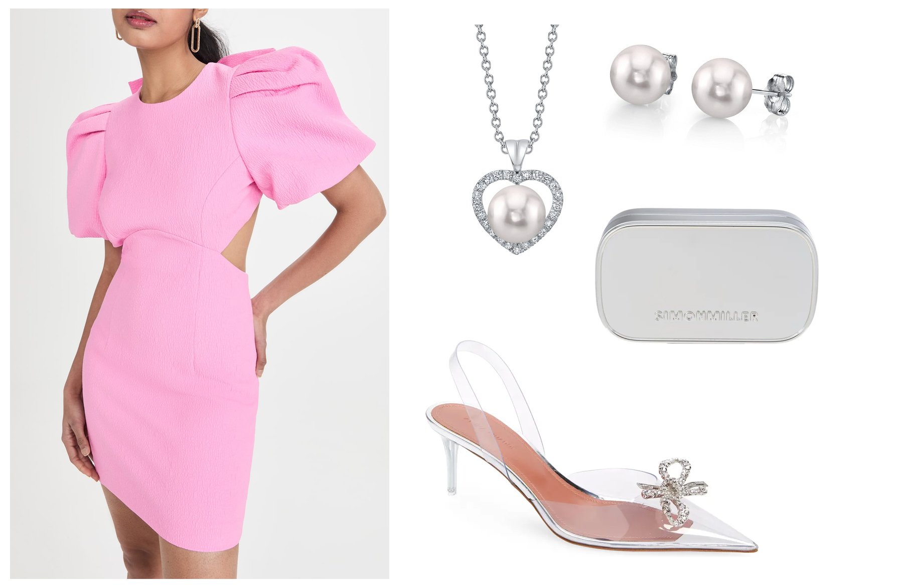 Backless Bow Pink Costume / Coronary heart Akoya Pearl Pendant / Akoya Pearl Studs / Metallic Clutch / Rosie Glass Slingback Pump