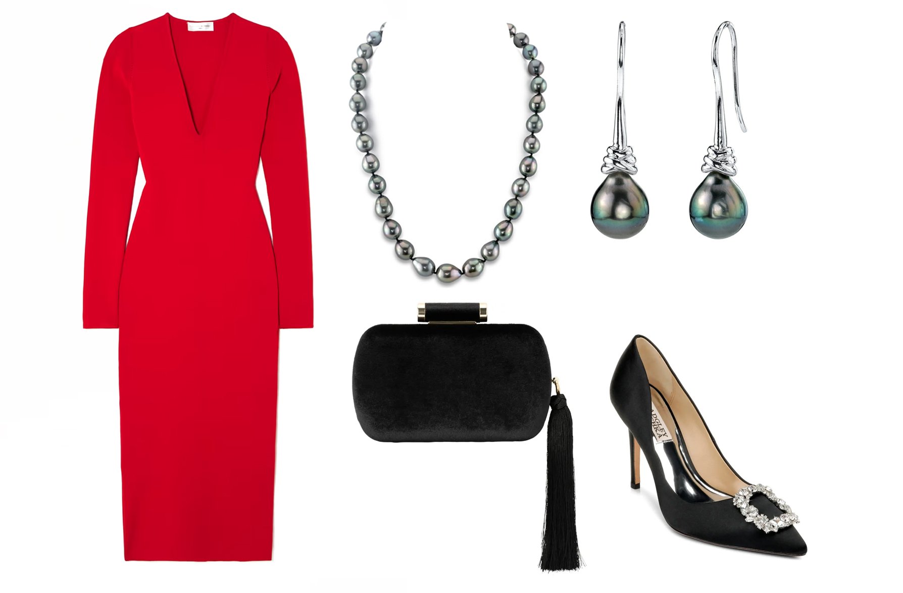 VB Physique Ribbed Midi Costume / Tahitian South Sea Drop Pearl Necklace / Matilda Velvet Clutch / Tahitian South Sea Drop Pearl Earrings / Cher Crystal Embellished Pump