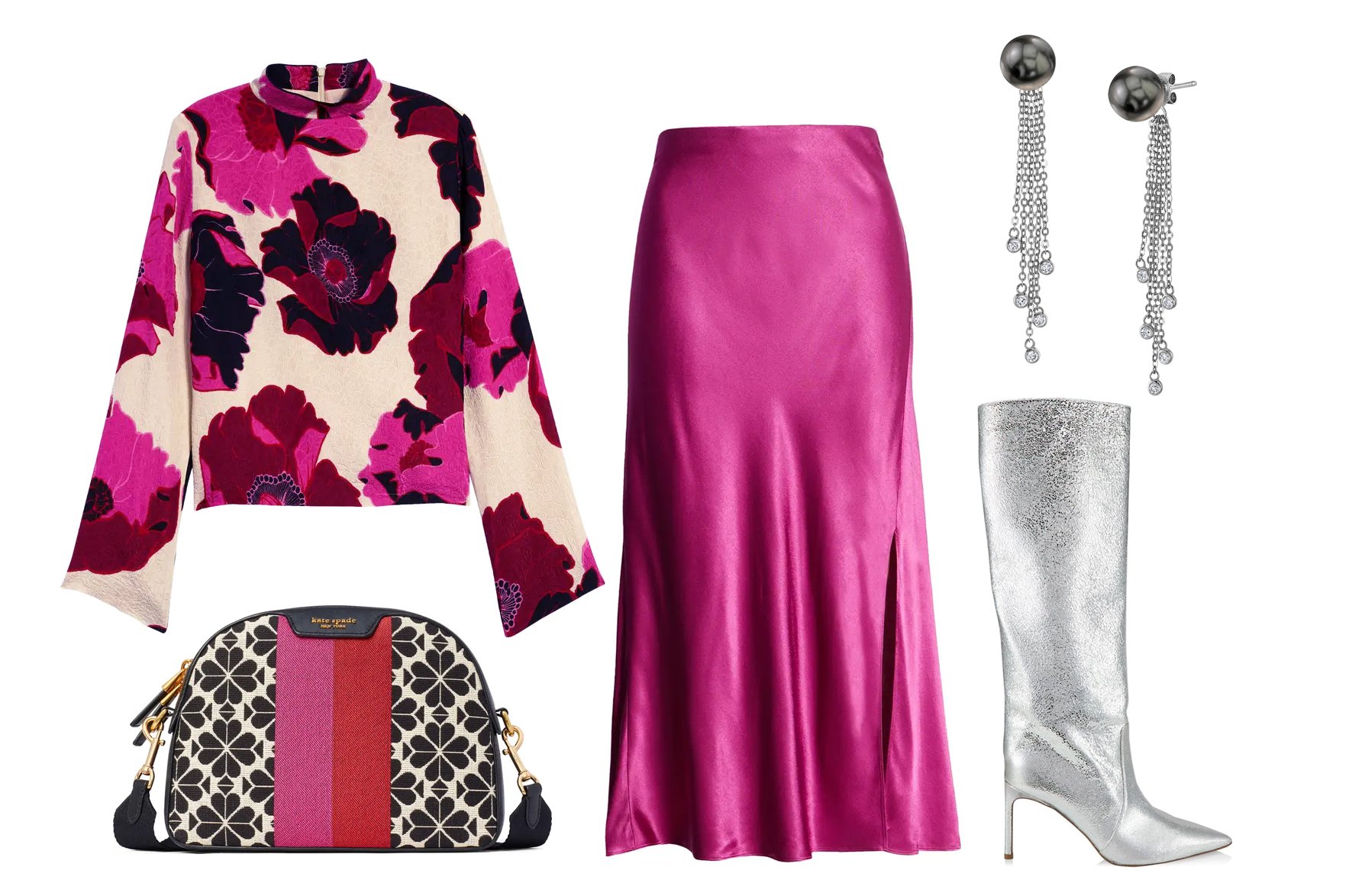 A much less predictable method to embrace the Valentine’s Day festivities is by taking another shade route. Meet fuchsia, aka pink’s scorching cousin. Swap the hearts for florals and geometric patterns for a playful mixture of prints that conveys eclectic allure. A satiny skirt in a daring shade is a no-fuss, simple choice for a glance that’s totally polished but easy. Pair all of it up with silver particulars for a glance that actually shines.