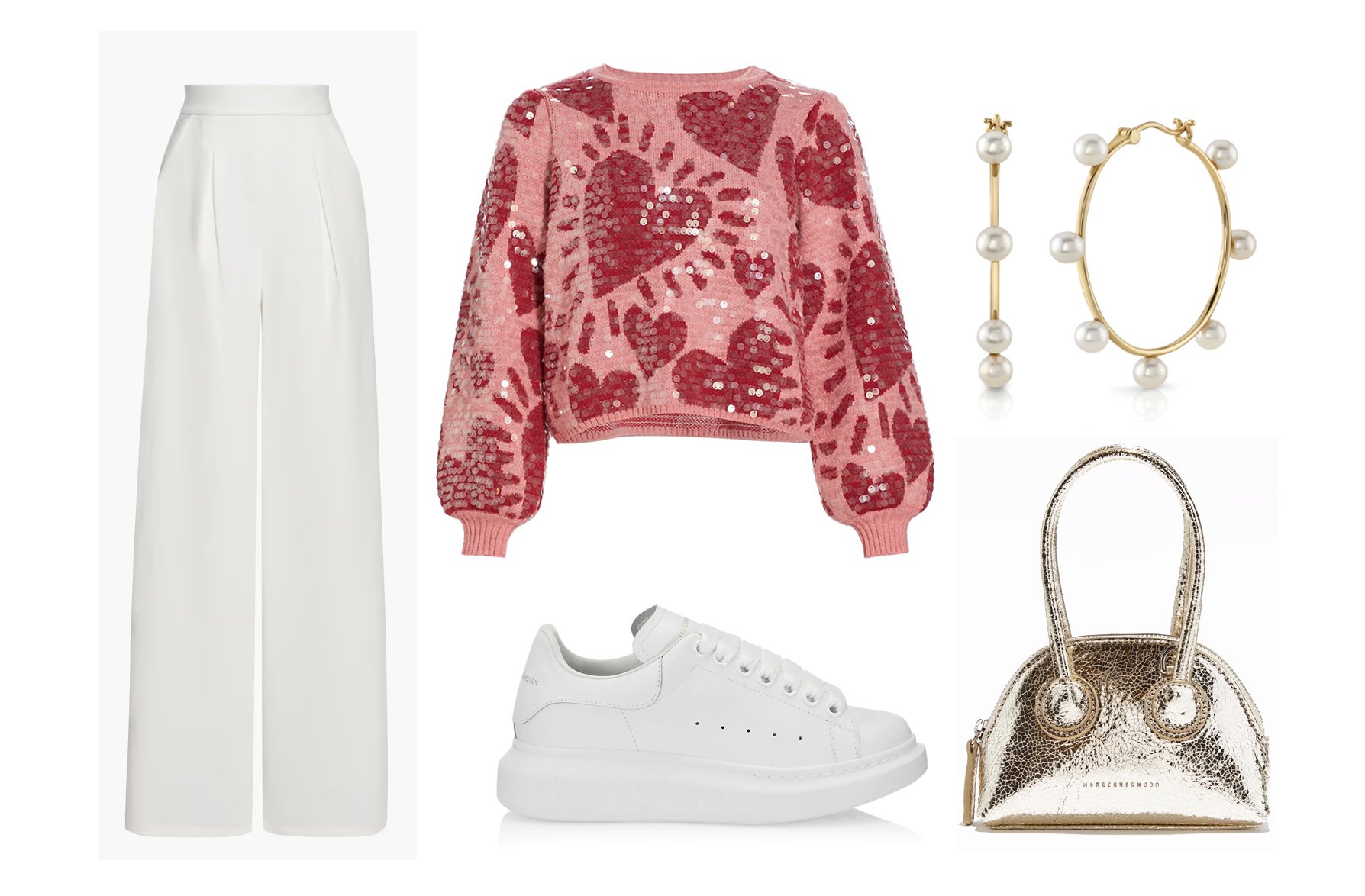 Pleated Large Leg Pants / Hearts Sequined Sweater / Ladies’s Outsized Sneakers / Freshwater Pearl Hoop Earrings / Metallic Mini Shoulder Bag
