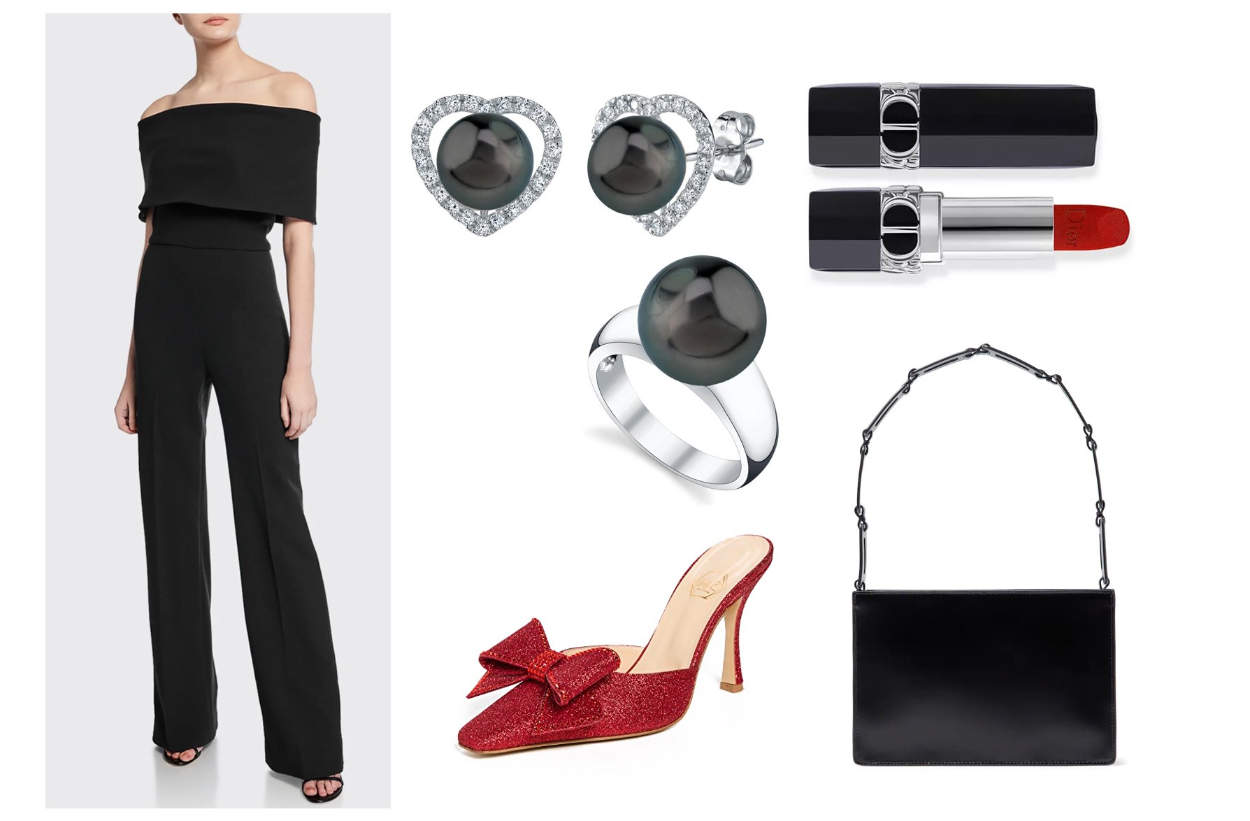 Crepe Jumpsuit / Tahitian South Sea Pearl & Diamond Coronary heart Earrings / Tahitian South Sea Pearl Ring / Diamante Glitter Mules / Rouge Dior Lipstick / Leather-based Shoulder Bag
