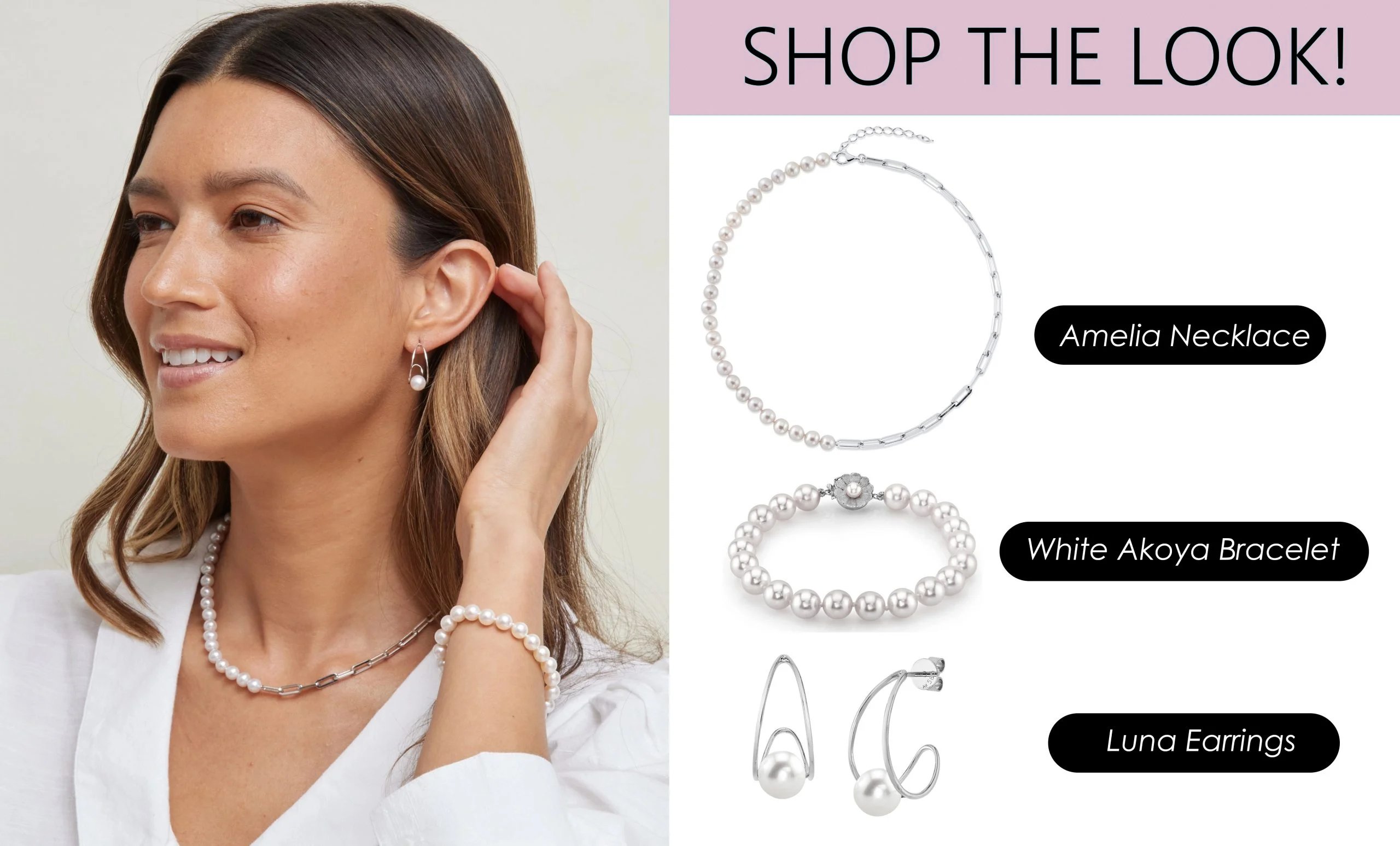 Store the Amelia Necklace / Purchase the White Akoya Bracelet / Store the Luna Earrings