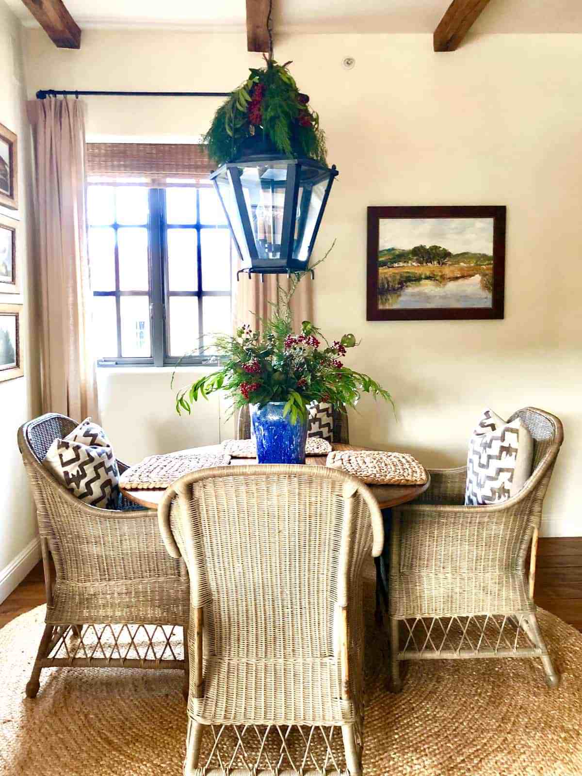 Cindy makes use of a small spherical desk and wicker chairs on a spherical sisal rug in her kitchen. Once more, right here she says she’s utilizing fake berries with contemporary greens.