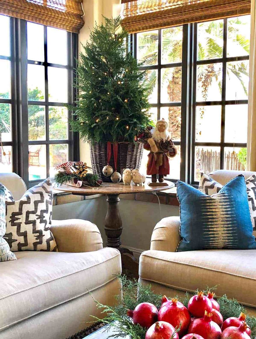 A small tree in a nook on a spherical desk with white lights is an ideal addition in her lounge. On the desk she has contemporary pomegranates in a bowl with contemporary greens.