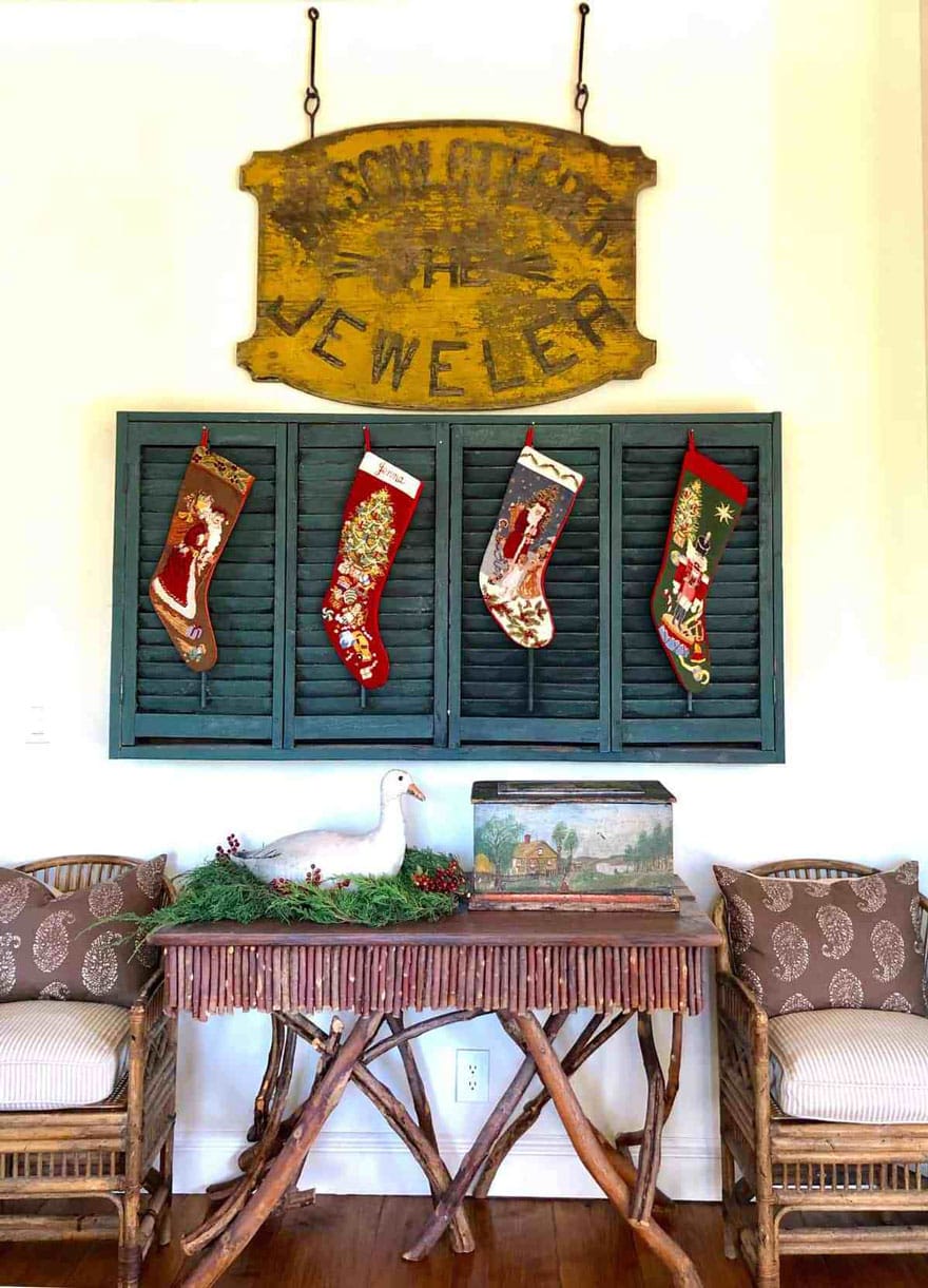 Cindy has a simple manner of incorporating the vacations into her dwelling. She used her needlepoint stockings and hung them on her classic inexperienced shutters. I really like how she used ticking stripe on her chair cushions mixed with Peter Dunham Kashmir Paisley print pillows. She mixes contemporary greens and even a number of fake berries for somewhat vacation combine on her twig desk. Cindy says she doesn’t thoughts mixing in somewhat fake if it seems to be actual.
