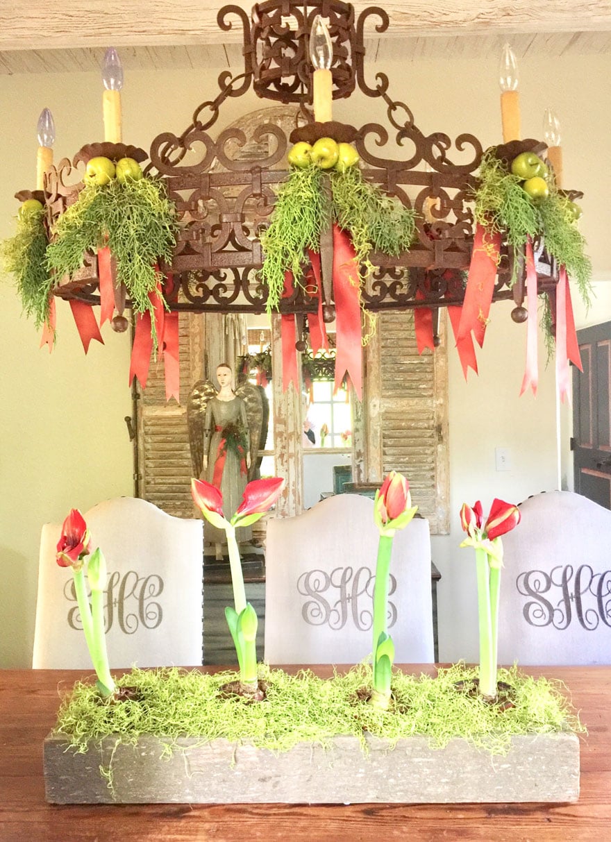One other instance of how Cindy incorporates rustic with refined is her chandelier. She makes use of contemporary greens, silk ribbons and amaryllis bulbs in a stone planter along with her monogrammed chair covers. No element is missed at Cindy’s. She additionally helps her son and daughter-in-law with decor at their craft beer and wine bar in historic downtown Salinas, California, Farmers Union Pour Home