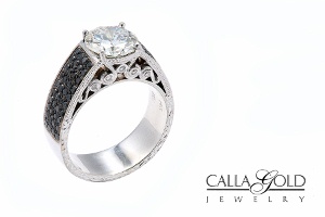 This Diamond Ring Has Black Diamonds on the Side and Curlicue Edge Details