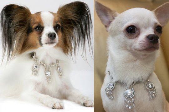 I’m thinking if you’re going to rock your dog with diamonds, you need a small dog. When I photographed some of my jewelry on a large dog owned by my client years ago, it didn’t show up well at all. But the little Papillion and the Chihuahua in the picture, show those diamonds off with distinction.
