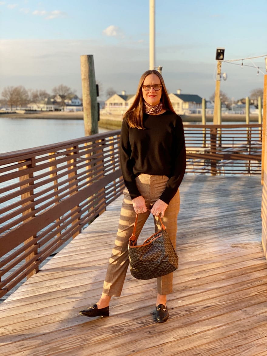 Wearing my favorite Everlane cashmere crew sweater. I size up and wear it over size like a sweatshirt. I have a few and wear them all the time with everything. The scarf from Madewell has the same colors as the pants from GAP. My Goyard bag has seen better days, but I love it anyway. My glasses are from Oliver Peoples and are not tinted even though they look like it...for some reason.