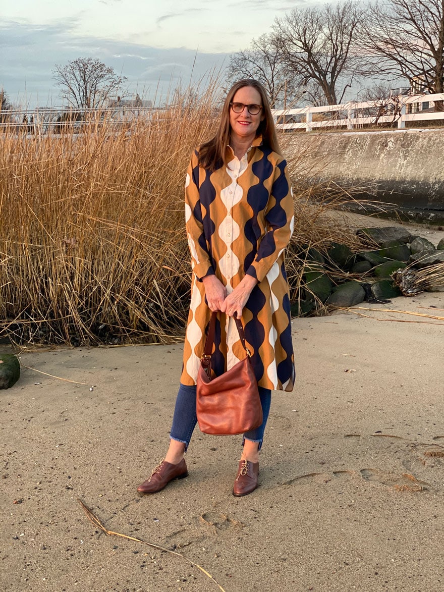 January is always a good time to take stock of what I have and not buy a lot of new clothes. It’s a time I like to cool it on the spending and organize and assess what I already own. In the above photo I’m wearing pants from GAP that were on sale for around $20 last fall. I’m wearing my vintage Cole-Haan oxfords, Coach Bucket Bag, a denim shirt from J.Crew and a Vince coat sweater. The denim shirt is super thick and I hated the way it felt in the arms when I layered it under a sweater, so I cut off the sleeves. It looks like I’m wearing a shirt, but it’s way more comfortable. I layer it under blazers with a t-shirt too. (I wore that Vince sweater in this post too).I found this dress as I was walking through the Uniqlo in the new Hudson Yards mall. It’s a lot of dress, but for the sale price of $20 I knew I could make it work over a pair of jeans (wearing my favorite leg makeup because it’s January in the northeast).
