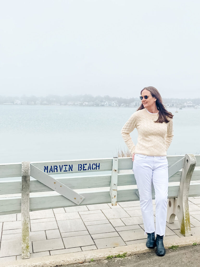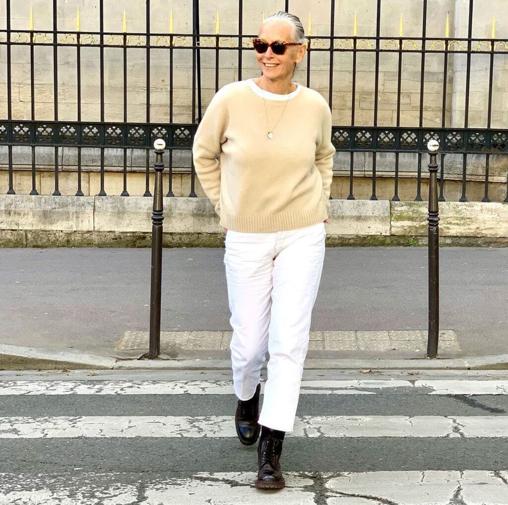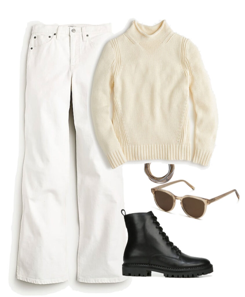 The correct answer is never, right? I wear them all winter. Of course, I grew up with the rule of no white after Labor Day, but that’s what I love about now…there are no rules. The only time I am sure to avoid white jeans is if there is rain in the forecast. I saw this on the Instagram of Linda V. Wright, the owner of Crimson in Paris, and thought….I’m going to copy that look. I have several pairs of white jeans and a stack of beige sweaters, I don’t have combat boots (I wear a size 10.5-11 so I have yet to find a pair that don’t look huge), so I’m wearing Prada boots that I’ve had forevvvvvvver. I am going to try these!