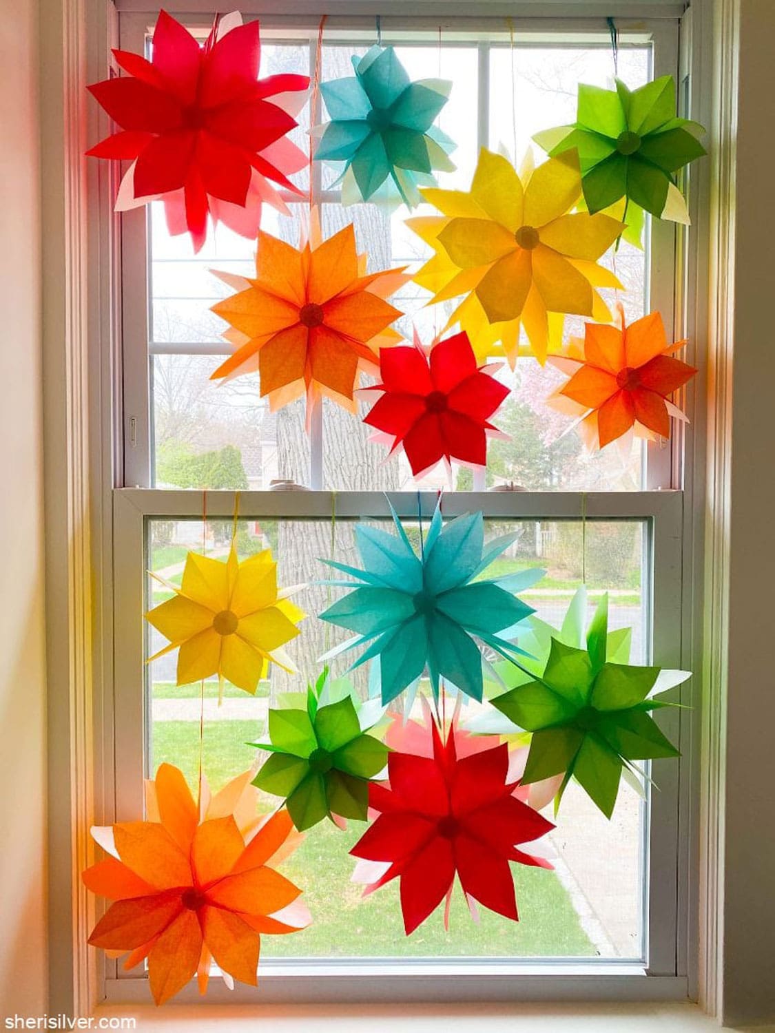 Sheri is so creative! I stopped by her house this week and saw these in her mudroom as I was leaving. I could not believe how beautiful and colorful they looked hanging in the window with the natural light filtering through them. She made them based on the giant paper bag snowflakes we made during the holidays. I think these are going to take off and become the new decoration for every holiday and celebration! I love the multi-colors, but all one color, color block, rainbow, so many possibilities….Read how to make them here!