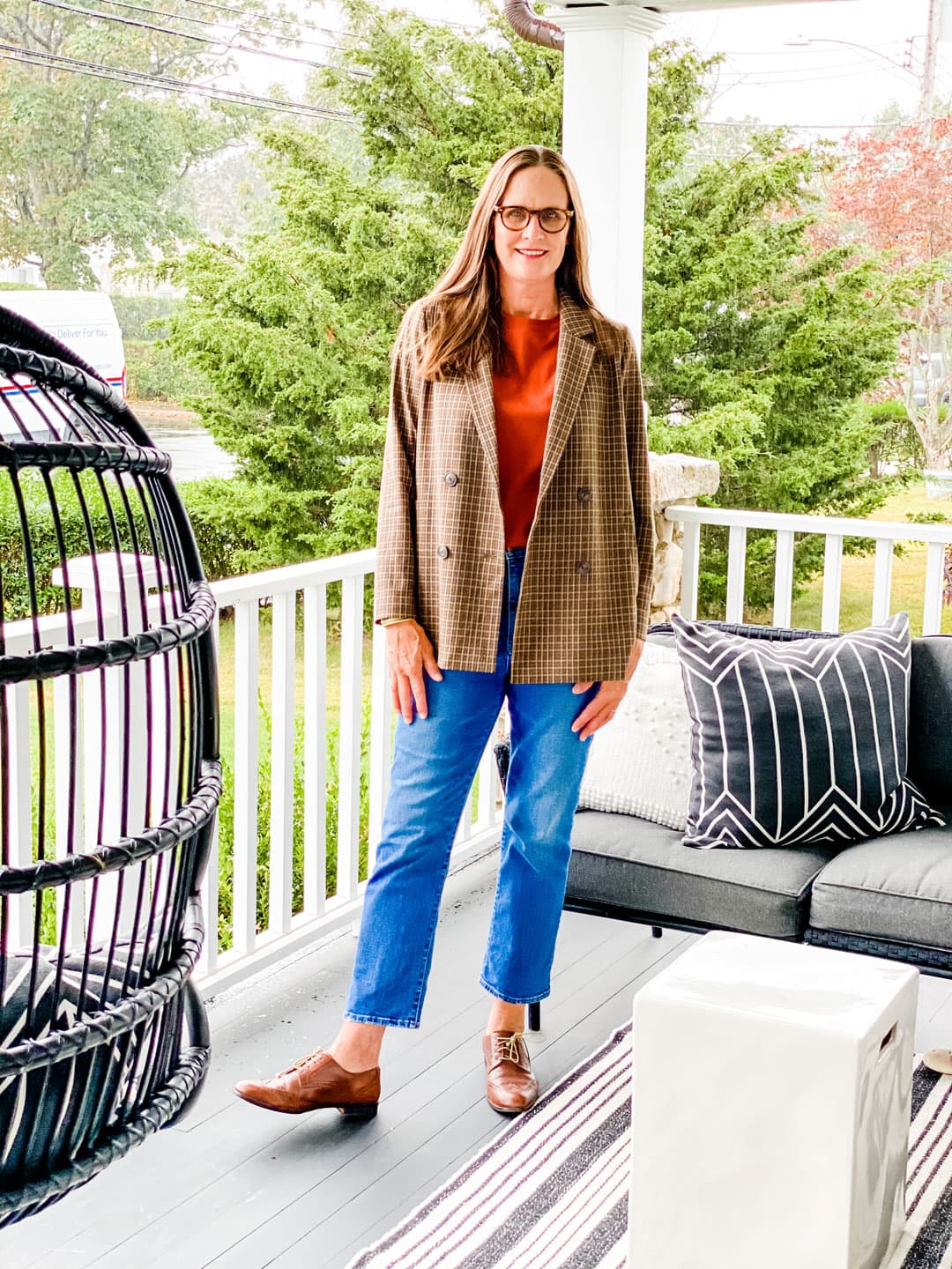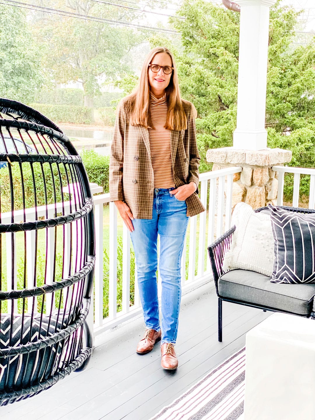 I love a fun jacket in the fall. I’m wearing it with a favorite Mock-Neck Tunic from Garnet Hill, but it will be perfect to layer a sweater under or a turtleneck when it gets a little cooler. I’m wearing jeans by Rag & Bone from a few years ago and my oxfords are probably 10 years old.